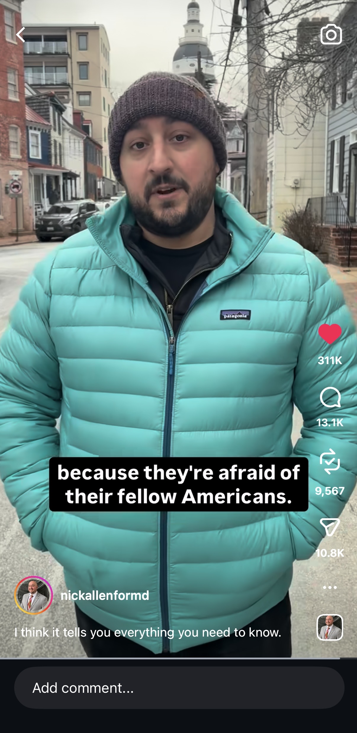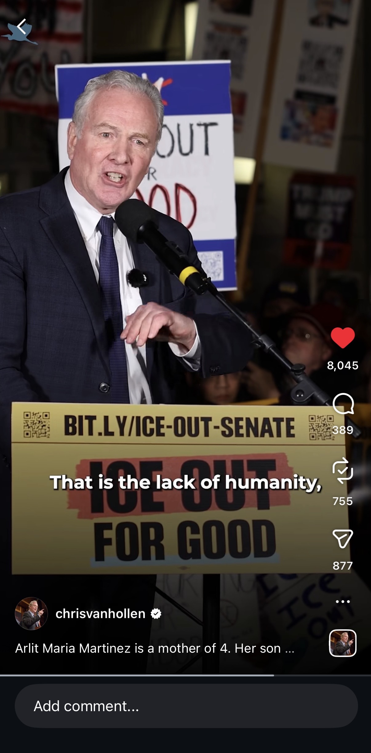 Left: Delegate Nick Allen’s viral video calling out ICE for masking to hide their identities. Right: Senator Van Hollen speaking at an anti-ICE rally, sharing the heartbreaking story of a mother in Maryland detained in ICE custody.