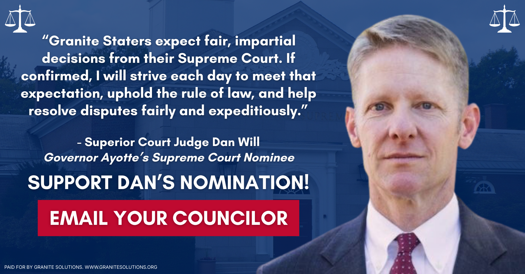 That’s why Governor Kelly Ayotte nominated Judge Dan Will to serve on New Hampshire’s highest court. Judge Will is a qualified, constitutional conservative with a proven record of fairness, judicial restraint, and respect for the rule of law.