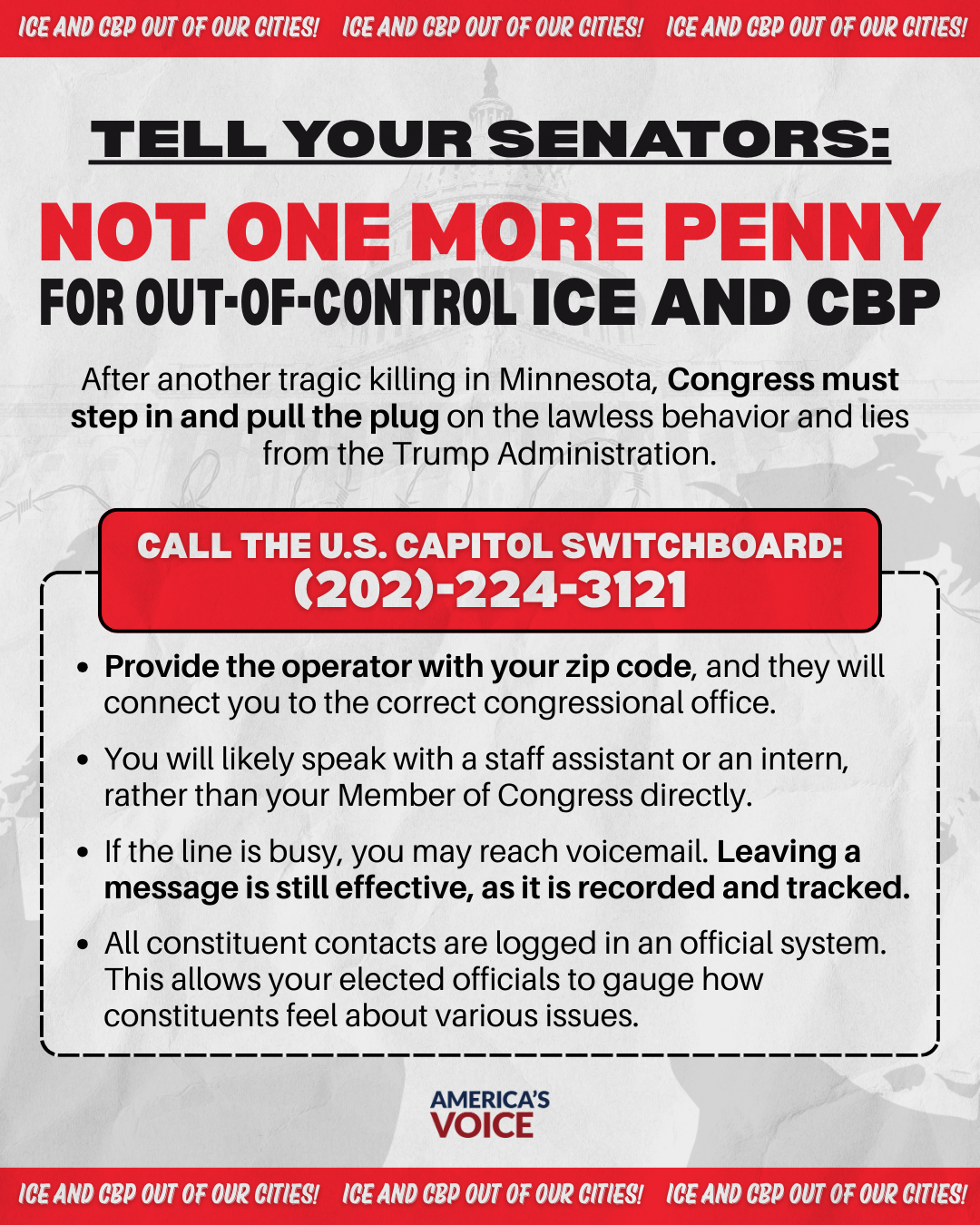 After another tragic killing in Minnesota, Congress must step in and pull the plug on the lawless behavior and lies from the Trump Administration. The Senate is voting on funding for the Department of Homeland Security (DHS) this week, and we need you to deliver a clear message: not one more penny for ICE and CBP.