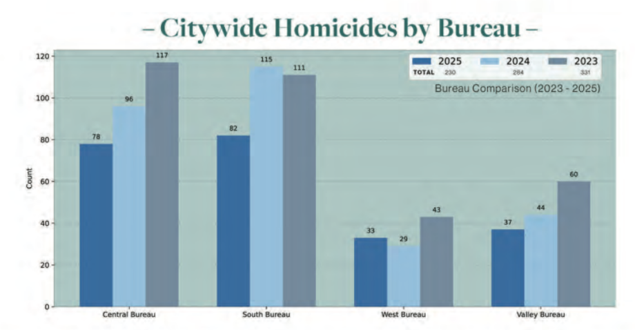The number of homicides in Los Angeles has dropped to its lowest level in 60 years, according to newly-released LAPD crime data. Police Chief Jim McDonnell laid out the details of LAPD’s 2025 citywide crime data analysis report during a press conference on Thursday. He says 2025 marks real progress when it comes to crime across the city – backed by lower homicide rates and fewer shooting victims. However, McDonnell highlighted areas that still need improvement, like homeless-related violence and fatal crashes that still take hundreds of lives every single year. According to the report, 2025 ended with 230 homicides – its lowest total since 1966 – and 54 fewer homicide victims than 2024, about a 19% decline. The report also shows fewer people were shot citywide. Shooting victims were down from 981 to 889, an 8% drop. However, LAPD said homeless-related homicides rose 20% to 61, and gang-related homicides were down just 4%, at 100. When it comes to traffic safety, LAPD reports 290 fatal traffic crashes, a decline from the year before. The report notes traffic deaths are still outpacing homicides across the city. When it comes to solving cases, LAPD officers say 156 of the 230 homicides were cleared – that’s about 68%. The department says the rate of citywide case clearance is listed at 101% — that’s because the data includes 76 homicides from prior years that were solved in 2025. The chief touted the department’s achievements during a Thursday press conference. “In 2025, there were 230 homicides, a reduction of 19% from the year before, when city experienced 284 homicides,” McDonnell said. “This is the lowest number of homicides since 1966.”