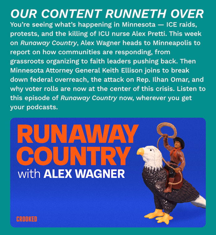 Any deal with Trump to avert a shutdown could blow up again, Warner said. “I, frankly, wouldn’t even be surprised.” WHAT ELSE? 👀Why did Tulsi Gabbard, America’s spy chief, tag along on the FBI’s raid on an election hub in Fulton County, Georgia yesterday? She’s investigating the results of the 2020 election, naturally. Trump has never given up trying to prove his bizarre, debunked, false claim that he really won the 2020 election. Gabbard’s involvement, though, is bizarre. American spy chiefs don’t usually investigate long-past elections! What A Day exclusive: Top Hill Democrats want Gabbard to explain herself. “The Intelligence Community should be focused on foreign threats,” they wrote to her. “Your recent actions raise foundational questions about the current mission of your office.” The Trump administration is considering new strikes on Iran to inspire fresh protests against the regime, according to Reuters. Striking Iran comes with big risks: The country still has thousands of missiles that can reach Israel, as well as U.S. bases in the region. Is there any problem Trump thinks can’t be solved with either a missile strike or a kidnapping? HHS Secretary Robert F. Kennedy Jr. tapped vaccine skeptics to serve on a federal panel that advises the government on autism. It’s just the latest disturbing example of the roadkill enthusiast attempting to promote his false assertion that vaccines cause autism. New York authorities arrested a Minnesota man who allegedly impersonated an FBI agent in an attempt to break Luigi Mangione, the suspected UnitedHealthcare CEO shooter, out of prison. The FBI’s involvement in the arrest of an alleged cocaine trafficker, who was also a Canadian Olympic snowboarder, was supposed to be a secret. But FBI Director Kash Patel couldn’t help himself from tweeting the news — even though the FBI isn’t allowed to make arrests in Mexico. Now, Mexico is pissed at Patel. And he looks incredibly stupid, once again. Can’t afford a home? I have a suggestion: Try being filthy rich! Sales are booming for properties that cost over $10 million, while the rest of the housing market craters. Is this why Trump literally said he wants housing costs to go up? (Answer: Yes, it is.) Want a terrible date night idea? Go watch the Melania Trump documentary, which debuts in theaters tonight! The film is expected to gross only a few million dollars on its opening weekend, despite Amazon shelling out $40 million to acquire it last year, and another $35 million for marketing. Jeff Bezos must really like it. LIGHT AT THE END… ☀️Scores of Americans are expected to participate in a nationwide strike tomorrow in protest of federal agents’ tactics across the country. “Every day, ICE, Border Patrol and other enforcers of Trump’s racist agenda are going into our communities to kidnap our neighbors and sow fear,” the website reads. “It is time for us to all stand up together in a nationwide shutdown and say enough is enough!” ICE stopped its “enhanced” operations in Maine after Sen. Susan Collins (R-ME) called Kristi Noem, the senator claimed. “There are currently no ongoing or planned large-scale ICE operations here,” Collins added. Would the senator perhaps like to make such a call on behalf of any other states? A man dressed as Batman berated Santa Clara city council members for allowing ICE to operate at the upcoming Super Bowl in the city. “I’m not begging you,” Batman said. “I’m fucking demanding that you act with some semblance of a fucking spine. Do something.” The video is so good. The Trump administration is delaying its attempt to eliminate the “endangerment finding” — a landmark ruling that allows the government to regulate greenhouse gas emissions — because it’s afraid the proposal won’t hold up in court. “Most of what EPA is doing will not stand up in a court of law,” Gina McCarthy, Obama’s EPA chief, told What A Day earlier this month. The Coast Guard used its only active heavy icebreaker (a specialized ship to clear ice) to rescue a luxury cruise ship that had been stuck in Antarctic ice. “On a danger scale of 1 to Endurance, the Scenic Eclipse II’s predicament was low-risk,” the Washington Post writes. Yeah… have you read about the Endurance expedition? You couldn’t pay me to take a boat to Antarctica! Are UFO’s real? Michael Shermer, a journalist who has been writing about the phenomenon for years has made up his mind: Nope. “What I think is actually going on is a deep, religious-like impulse to believe that there is a godlike, omnipotent intelligence out there who 1. knows we’re here, 2. is monitoring us and is concerned for our well-being and 3. will save us if we’re good,” Shermer writes in the Washington Post. And no, China and Russia probably haven’t developed a futuristic spy plane that is being mistaken for aliens, he writes. “Everybody Is Suddenly Obsessed With 2016,” reads a Wall Street Journal headline today, weeks after the trend peaked. But I digress; the article is a great explainer on why you probably saw people on social media sharing pictures of themselves from a decade ago, for no obvious reason. “There’s a yearning for what many people remember as a slower pace,” one youth consumer expert said. Gee, I wonder what happened at the end of 2016 that has made this decade feel really fucking long. A 91-year-old Nebraska woman planned to sell a 30-gallon stoneware crock that had been collecting dust for $20. The crock, which dates back to the 19th century and has a rare salt glaze, ended up selling for $32,000 at auction. “I just couldn’t believe it,” said the woman, whose birthday coincided with the sale. “It’s the biggest thing I’ve ever gotten on my birthday.” You’re currently a free subscriber to Crooked Media. For the full experience, upgrade your subscription. |
