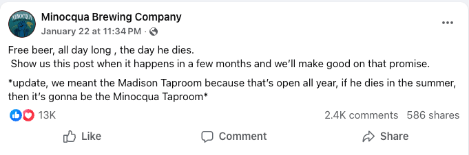 Wisconsin brewery vows free beer for Trump death partyA progressive Wisconsin brewery sparked national outrage by promising free beer all day long on the day President Donald Trump dies, posting the offer on Facebook last week and pledging to honor it “in a few months” with proof of the event. “Show us this post when it happens in a few months and we’ll make good on that promise,” the company wrote on social media.