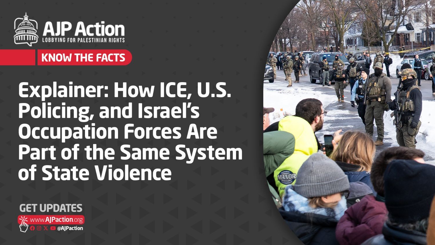 Calls to abolish ICE, defund militarized policing, and defend civil liberties cannot be separated from demands to end U.S. support to Israel Dear Email, AJP Action stands with our immigrant brothers and sisters and with communities in Minnesota and across the United States who are organizing, protesting, grieving, and demanding accountability in the face of aggressive federal enforcement. We unequivocally condemn ICE’s murder of Renée Nicole Good and Alex Jeffrey Pretti, as well as the countless people who have been killed by ICE or who have died in ICE custody and detention centers due to brutal conditions, medical neglect, and systemic abuse. These deaths are part of a broader pattern of state violence that disproportionately harms Black, Brown, immigrant, and working-class communities. We’re sharing a new explainer that lays out the connections between U.S. policing and Immigration and Customs Enforcement (ICE), and Israel’s occupation of Palestine, and why these cannot be treated as separate or siloed issues. The explainer examines: - How policing, deportation, incarceration, and surveillance in the U.S. function as a single system of state violence rooted in American history