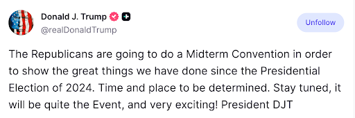 | With a single sentence, the White House just upended the midterms and delivered a crushing blow to the Democrats’ chances of victory… | | "We're going to put Trump ON THE BALLOT." | | This is the perfect solution to the biggest problem (decreased voter turnout) that’s been haunting Republicans all year long! | | Republican voters have always shown up to vote in record numbers when President Trump is on the ballot, and this announcement will turbocharge our numbers so we can WIN BIG and SAVE AMERICA, just like we did in 2024! | | As part of President Trump’s new active role on the ballot, he’s going to take to the campaign trail to hold “near-weekly” Trump midterm rallies. | | But one event, recently announced by the President himself, will surpass them all… | | That’s right – now that we’re in an election year, President Trump and the GOP will be holding an UNPRECEDENTED midterm convention to officially set our platform for the most important midterm elections in history! | | But that platform can’t be written by Washington politicians, John. | | Instead, we need grassroots America First patriots like YOU to weigh in and help us write our winning platform at this make-of-break moment for our country. | | Paid for by Team Elise, a joint fundraising committee authorized by and composed of E-PAC and Save New York. www.elisestefanik.com | | PO Box 500 Glens Falls, NY 12801 | | This email was sent to: [email protected]. We believe that email is a vital way to stay in direct contact with supporters, but you can click here if you would like to unsubscribe from these messages. | |