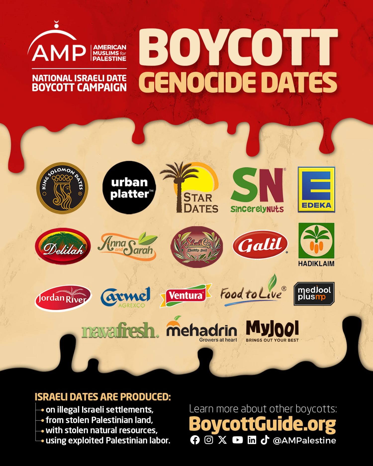 AMP Relaunches Annual Date Boycott Campaign Dear Email, "It's a crisis the likes of which we have never experienced." Those are the words of an Israeli farmer quoted in a recent Mondoweiss article describing the collapse of Israel's export of agricultural goods amid global boycotts. "Brand Israel" has become too toxic, even for the usual European markets that consume much of Israel's agricultural output. Israel is finally paying the price for genocide. The Mondoweiss piece describes Israeli reports on the collapse of mango and citrus exports and how farmers are pleading with the Israeli government to intervene to save their industries. International boycotts and the closure of access to the Red Sea have decimated Israel's agricultural exports globally, and AMP's annual date boycott seeks to drive the last nail in the coffin. The Campaign AMP's annual date boycott campaign, which has run for more than 13 years, has decimated Israel's market share in the US date market. What used to be the largest share of imported dates to the US has now diminished to number five or six on the list of imported dates, eclipsed by dates from Mexico, Tunisia, Algeria, Turkiye, and Saudi Arabia. Consumers are well aware of Israel's rebranding techniques and have pushed both retailers and distributors away from Israeli dates. This year, join us to end the import of Israeli dates once and for all. Find more information about the national date boycott on boycottguide.org Brands We get a lot of questions about brands to boycott. All of the brands we highlight are based on our research team’s meticulous study of the US market. However, because Israeli date companies have been white-labeling products (allowing other brands to stick their name on the dates) to avoid boycotts, there may be more brands we are unaware of. We also often get questions about which dates to buy. Our mantra is that everything is fair game for purchase unless it's explicitly not. Many companies sell dates across the US and globally, and they are great to buy from. Our objective is to make you, the consumer, aware of what not to buy. Take Action You can find all the resources you need to boycott Israeli dates here on our site, including graphics, brand names, social media materials, and more. Play a role in advancing the boycott of Israel through your boycott of Israeli dates. In solidarity, American Muslims for Palestine (AMP) |