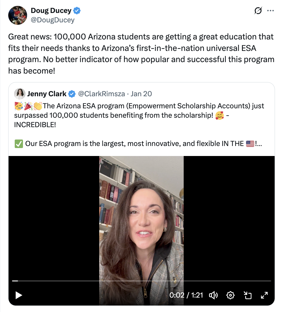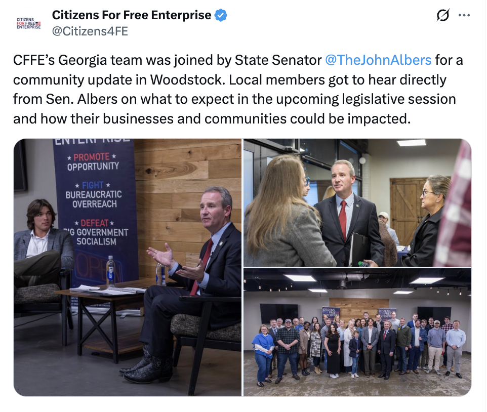 I first want to begin by expressing my deepest condolences to the family of former Attorney General Mark Brnovich. Our tenures in public office overlapped so I was lucky to know General Brnovich well -- he was the embodiment of a happy warrior. Deeply devoted to the law and justice, he also had a humorous, positive side that was infectious. May he rest in peace. At Citizens for Free Enterprise, we were lucky to be joined by State Senator John Albers in Woodstock, Georgia. Local business members were invited to attend the event where Senator Albers gave his perspective on legislative priorities in the 2026 session and attendees were given the opportunity to ask questions. Our Georgia team did a great job putting on this event. In Arizona, we just got some GREAT news: our first-in-the-nation universal ESA program just broke the 100,000 marker. Think about it, 100,000 Arizona students are now able to access a high quality education that fits their family's needs. There truly is no better indicator of how popular and successful this program has become. It's no wonder our program has become a model for the nation. Citizens for Free Enterprise CEO & 23rd Governor of Arizona Paid for jointly by Citizens for Free Enterprise and Citizens for Free Enterprise Action. Citizens for Free Enterprise and Citizens for Free Enterprise Action are separate and distinct organizations. Not paid for by any candidate or candidate's committee. To unsubscribe from Citizens For Free Enterprise, click here