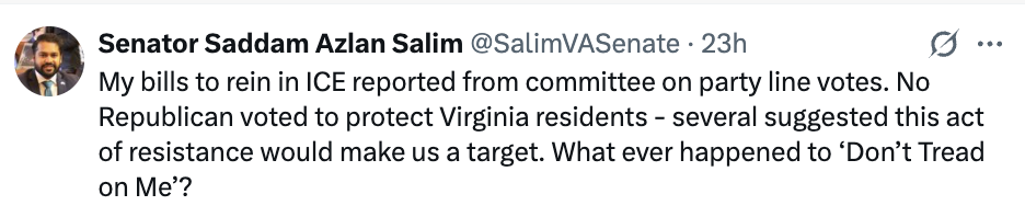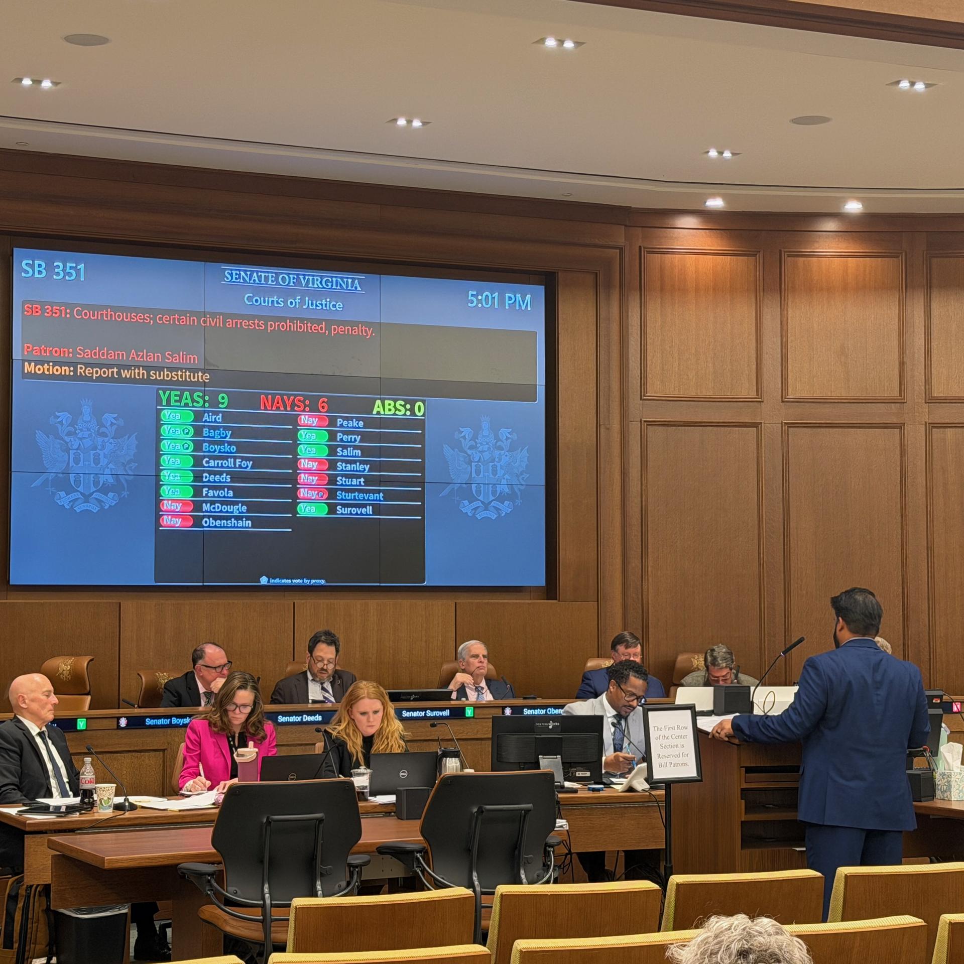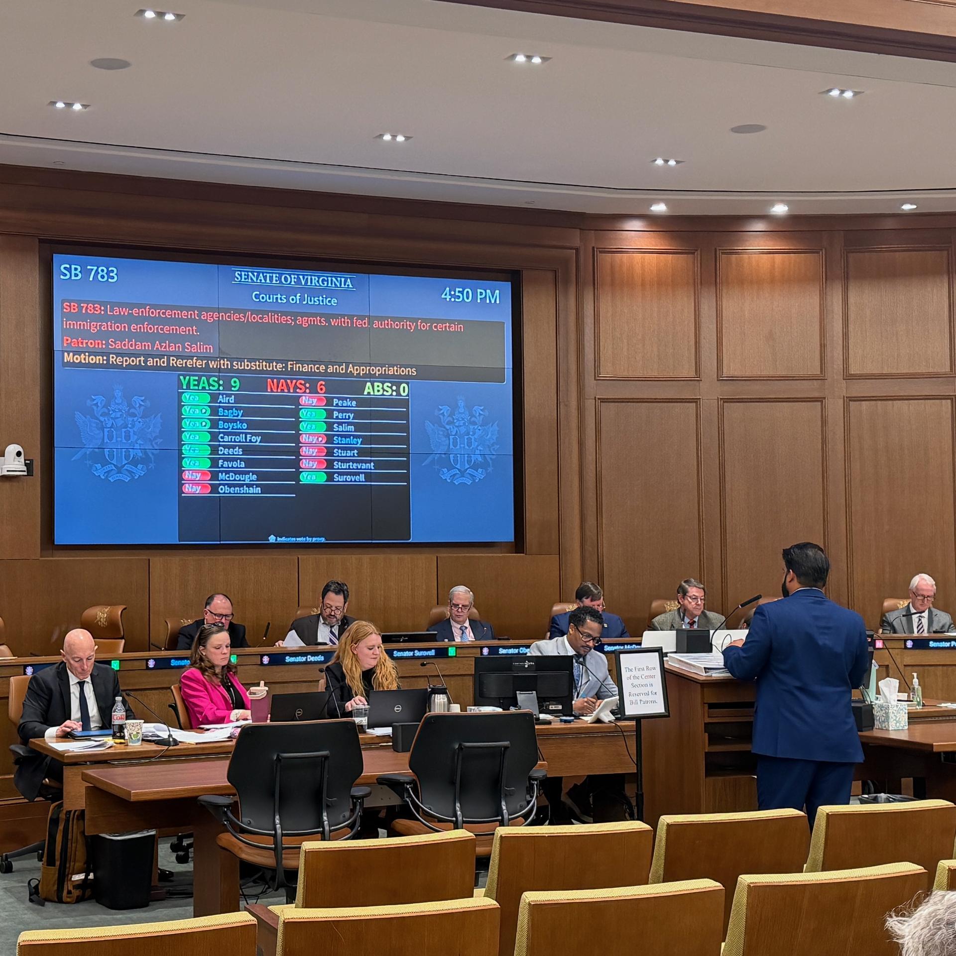 The three bills I have introduced to address this injustice, SB351, SB352, and SB783, reported out of the Courts of Justice committee on party line votes Wednesday evening. My bills would put reasonable guardrails around cooperation between the federal government and our state and local law enforcement.