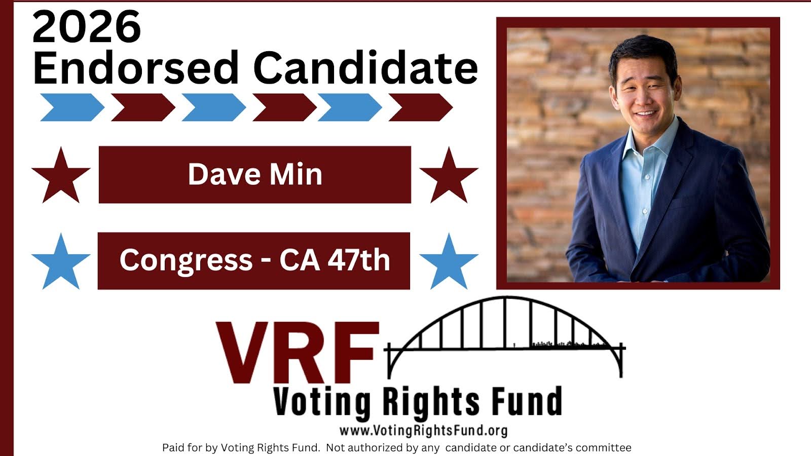 The Voting Rights Fund is proud to endorse Rep. Dave Min for re-election of California’s 47 Congressional Seat in 2026. Dave Min is one of the most important voices fighting for democracy in Congress today. We first met Congressman Min during the 2024 campaign, and we’ve been inspired by his dedication to standing up for all Americans ever since.
