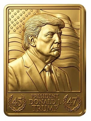 The front features a highly detailed sculpted portrait set against a flowing American flag, flanked by the historic 45 / 47 insignia. The reverse showcases the presidential seal with the timeless message “Make America Great Again”, framed by laurel branches and official U.S. symbolism.