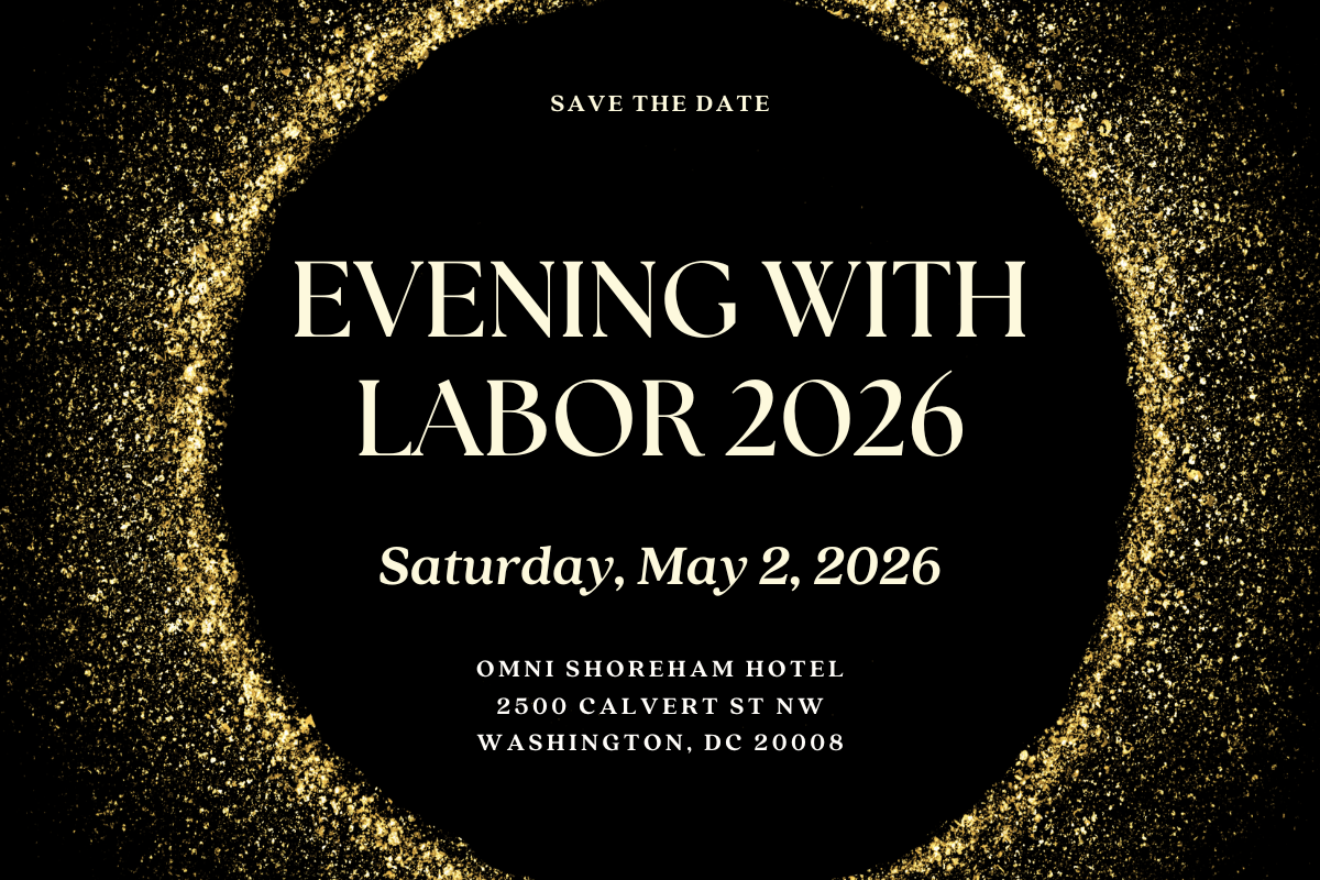 Save the Date! Evening with Labor 2026 will take place on Saturday, May 2, 2026 at the Omni Shoreham Hotel in Washington, DC. Registration details to come. We look forward to this powerful evening of solidarity and celebration.