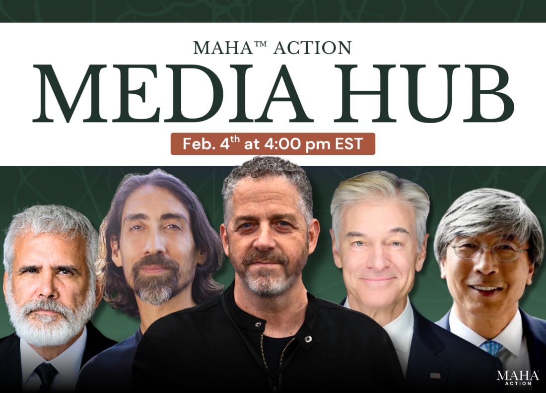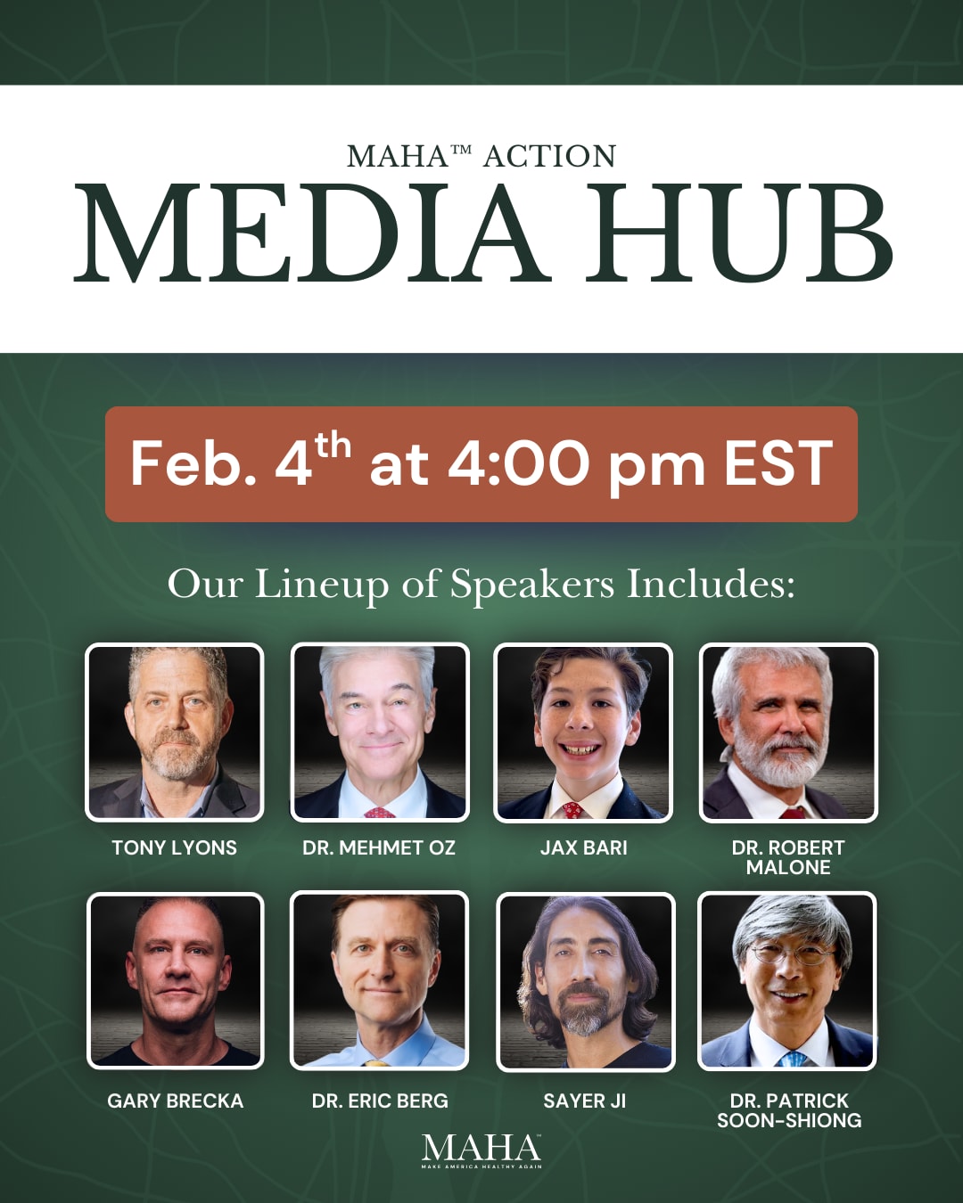 Please join us on Wednesday, February 4, from 4pm - 5pm Eastern, for the MAHA Action Media Hub, featuring the most influential voices of the MAHA movement. The roughly 70-minute discussion keeps you up to date on MAHA news, including the latest from HHS and from the movement’s strides forward in areas ranging from autism to cancer to addiction to nutrition. This week’s program features MAHA Action president and host, Tony Lyons; human biologist, biohacker, and longevity expert, Gary Brecka; Administrator of the Centers for Medicare & Medicaid Services (CMS), cardiothoracic surgeon, and health advocate, Dr. Mehmet Oz; young celiac disease advocate and activist known as the MAHA Kid, Jax Bari; globally recognized health educator and author, Dr. Eric Berg; virologist, immunologist, and member of the Advisory Committee on Immunization Practices (ACIP), Dr. Robert Malone; founder of GreenMedInfo and alternative health researcher and author, Sayer Ji; cancer immunotherapy pioneer, founder and Executive Chairman of ImmunityBio, and global chief scientific and medical officer, Dr. Patrick Soon-Shiong; Deputy Secretary of Health and Human Services and acting director of the CDC, Jim O’Neill; HHS Secretary Kennedy’s Deputy Chief of Staff and Special Counselor, Stefanie Spear; comedian, actor, podcaster, and health freedom advocate, Russell Brand; and computational toxicologist, acting NIH Deputy Director for Program Coordination, Planning, and Strategic Initiatives, Dr. Nicole Kleinstreuer. To attend this week’s event, simply click the free registration link here. All of our Media Hub events are open to the public and the press. We hope to see you Weds@4pm!! Thank you for subscribing to The MAHA Report You can follow us at: TheMAHA_Report on X You can also follow us at: MAHA Action on Facebook Make America Healthy Again™ and MAHA™ are trademarks owned by MAHA TM LLC |