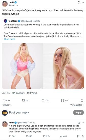 A note from Garry Kasparov: We’ll be hosting our next premium subscriber Zoom call TODAY, Tuesday, February 3 at 5pm ET. This isn’t a lecture. It’s an opportunity to actually get some face time with one another. ICE. Iran. Venezuela. Russia-Ukraine. Greenland. It’s all fair game for discussion. Click here to register. Evan Gottesman is managing editor of The Next Move and the director of communications and special projects at the Renew Democracy Initiative. Wake up babe, new Sydney Sweeney controversy just dropped! The 28 year-old actor’s latest offense? Stubborn political neutrality. Tedious as it is, we have to talk about Sydney Sweeney because the obsession with her is verging on religious pandemonium, and it’s hurting the fight for liberal democracy. To understand why, let’s rewind the clock to the halcyon days of summer 2025. The Trump administration was already running roughshod over norms and institutions. Wanting for something more important to talk about, parts of the left erupted into moral panic over an ad campaign Sydney Sweeney ran with American Eagle under the tagline “Sydney Sweeney has great jeans” (a play on genes). A Nazi dog whistle! An appeal to eugenics! These were real sentiments expressed by real people with big followings. It was an insane accusation that would not make sense to anyone who is not terminally online. No one could fathom that a company was trying to sell denim with a cheap pun and a conventionally attractive celebrity. Over the past half year, there have been numerous attempts to out Sweeney as MAGA. Internet sleuths found someone with her name registered as a Republican in Florida. In November, a GQ reporter pressed Sweeney to apologize for the jeans ad. The reporter’s meme-worthy look of disbelief went viral after Sweeney refused to recant. More from The Next Move: Now Sweeney is back in the news for an interview she did the other day with Cosmopolitan. “I’ve never been here to talk about politics,” Sweeney told the magazine when asked about being called “MAGA Barbie” (kind of a sexist barb, don’t you think?). After the Cosmo interview, political influencer and sanctimonious buzzkill Matt Bernstein snarked, “if in the big year 2026 you as a rich and famous celebrity adored by the president and attending bezos wedding think you are an apolitical entity then i don’t really know anymore.” (Sweeney was far from the only celebrity at Bezos’s wedding—the man owns a big movie studio, and yes, I get that this is part of the problem). Bernstein has two million followers on Instagram including New York City Mayor Zohran Mamdani and the ACLU. His video takedown of Sweeney broke 600,000 likes with millions more views. Other TikToks and reels dragging the actor’s anti-politics interview climbed to the top of the algorithm last week. This kind of content makes the rounds and reinforces the left’s reputation for hall monitor behavior. There is no discernable upside to influencer-activists taking up a crusade against a generally well-liked celebrity whose worst action appears to be inaction. Is the goal to cancel Sydney Sweeney? Leaving aside the ethics of social exile, the actor is too popular to land a conviction in the court of public opinion based on scattered circumstantial evidence. She will still be cast in movies and TV shows, and people will still watch them. Is the goal to get her to speak up on America’s constitutional crisis? If so, Sweeney’s critics are doing a bang-up job of that. All of the questions lobbed at her basically come down to the overly-broad “what do you think of politics?” or, less generously, “are you racist?” If we really believe it’s important that she speak out then why not pose a more pointed question about ICE or election denial or some other relevant issue? Or perhaps there is no goal. Mindless destruction for the sake of a mindless discourse. Petty persecution instead of a bold stand for liberal values. Don’t read this as a defense of Sweeney’s dogged neutrality. Personally, I would not want to be friends with someone who cannot pick a side when government agents are tormenting migrants and killing American citizens in broad daylight. But Sydney Sweeney is not my friend, and she is not yours either (sorry to shatter any weird fantasies). More than that, Sweeney’s non-partisan orientation is not the worst-case scenario. And it is not guaranteed forever. The denim debacle put Sweeney on Donald Trump’s radar by opening up a new front in the culture war. The president raved that the American Eagle was “fantastic”. If the right wants to co-opt Sweeney, they have an easy path. The loudest voices on the left have been consistently uncharitable with her and it’s natural to gravitate away from those who are mean to you. Sweeney—who has tens of millions of followers on social media—will do a lot more damage as a spokesperson for Trumpism than she is doing non-aligned. If that’s not convincing, think about how many normal people find this kind of purity politics alienating. Of course, strategic considerations might not be important for content creators like Matt Bernstein—they’re ultimately businesspeople whose clicks come from the already converted. If Sweeney does go full MAGA, the inquisitors will just be happy to have unmasked another witch. More from The Next Move: |