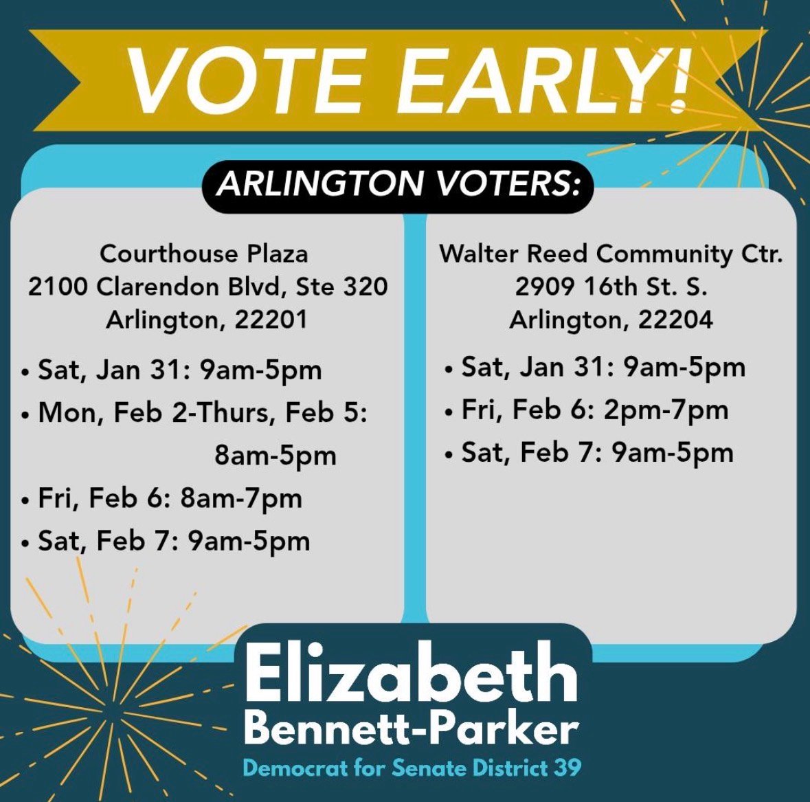 Next Tuesday, February 10th is the special election to replace Senator Adam Ebbin. Delegate Elizabeth Bennett-Parker is the Democratic nominee in SD-39. This district represents parts of Arlington (Crystal City, Pentagon City and Aurora Hills). Please see below for information on early voting, and if you live in the district make sure to cast your ballot on or before next Tuesday!