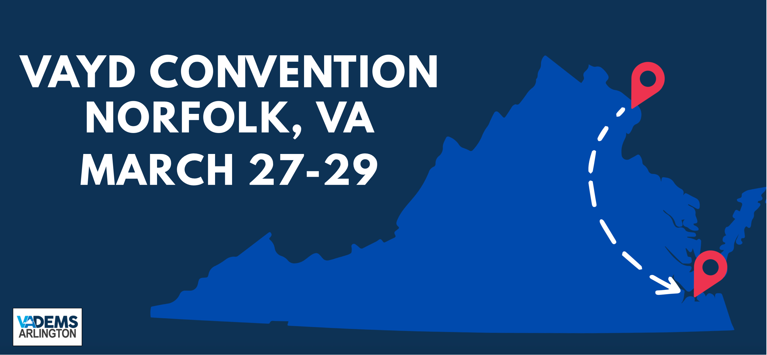 The Virginia Young Democrats have recently announced that their 2026 annual convention will take place from March 27-29 in Norfolk! This is a great opportunity to connect with Young Dems from across the Commonwealth and have your voice be heard in VAYD's leadership reorganization.