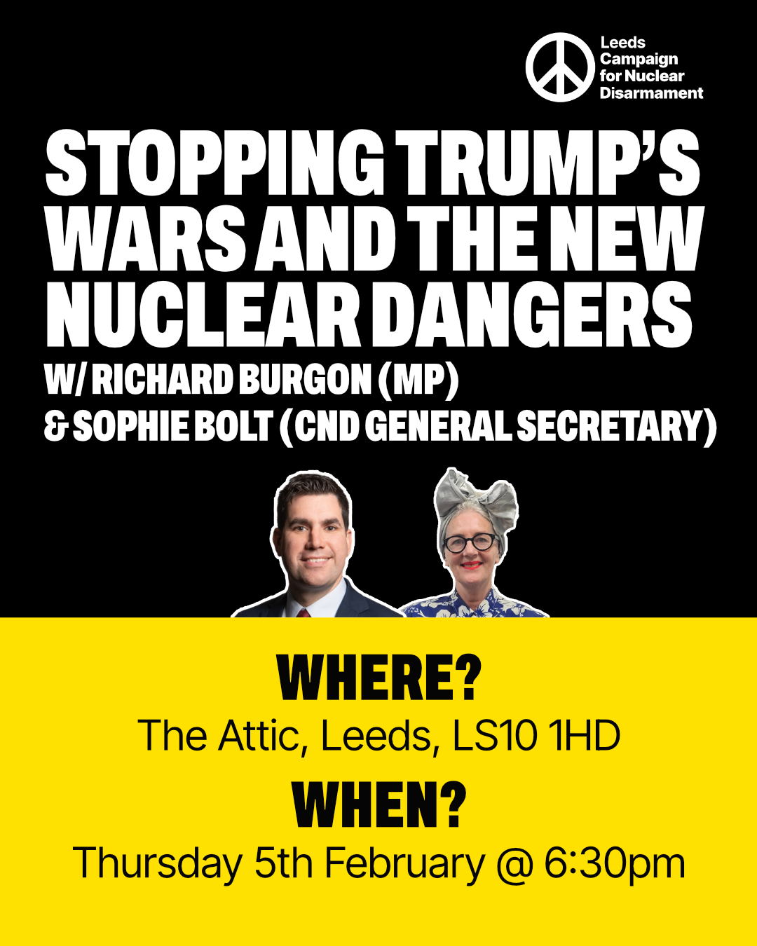 Leeds MP Richard Burgon and CND General Secretary, Sophie Bolt, will be speaking at the relaunch meeting of Leeds CND, this Thursday, 5 February. In “Stopping Trump’s wars and the new nuclear dangers,” they’ll be addressing Donald Trump’s belligerent foreign policy and why we need to close down US bases in Britain. If you live in and around Leeds please do get along to help strengthen CND's vital campaigning work.