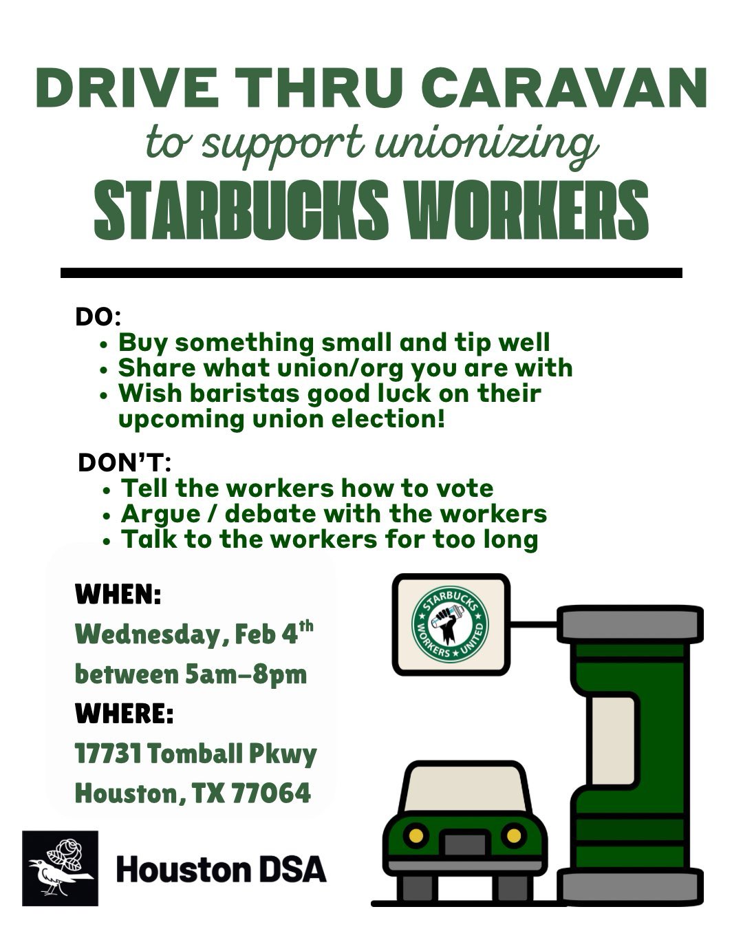Calling all Comrades! Wednesday, February 4th from open to close we are asking you to hit up the drive thru of the Starbucks at 17731 Tomball Pkwy Houston, TX 77064. Order something small, tip well and wish the Baristas good luck with their Union Election!