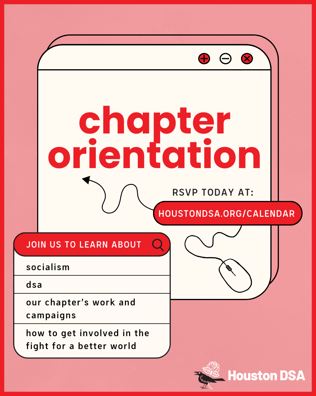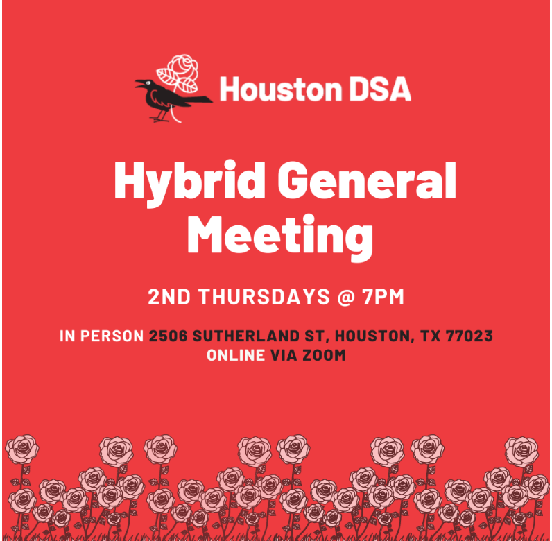 Houston DSA’s monthly general meetings are where the membership comes together to be in community and discuss the activities going on within our own chapter and the national DSA. This general meeting will have bylaws and electoral endorsement votes taking place - members are highly encourage to come and participate!