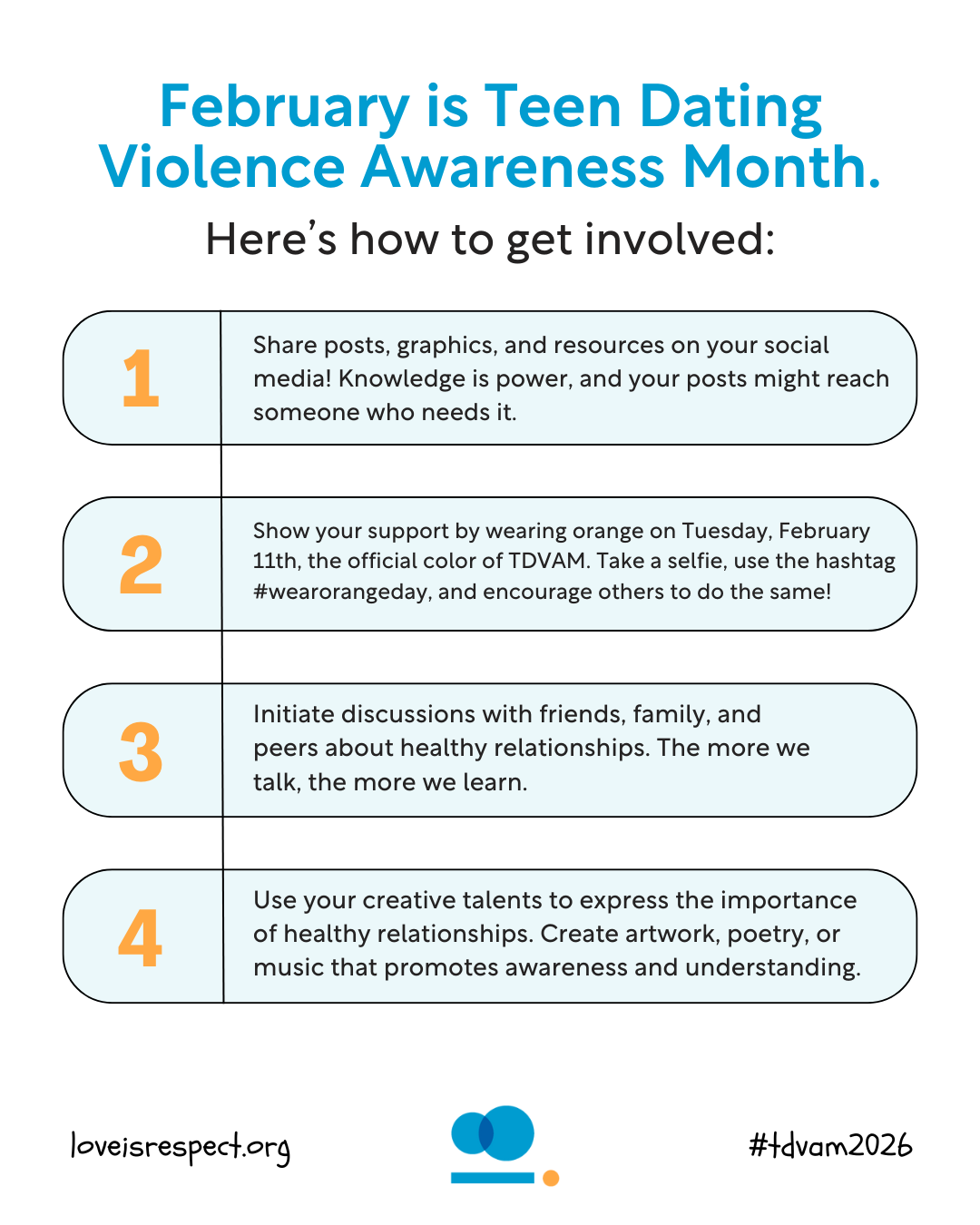 "Each February, young adults and their loved ones nationwide raise awareness about teen dating violence through Teen Dating Violence Awareness Month (TDVAM). This annual, month-long effort focuses on advocacy and education to stop dating abuse before it starts."