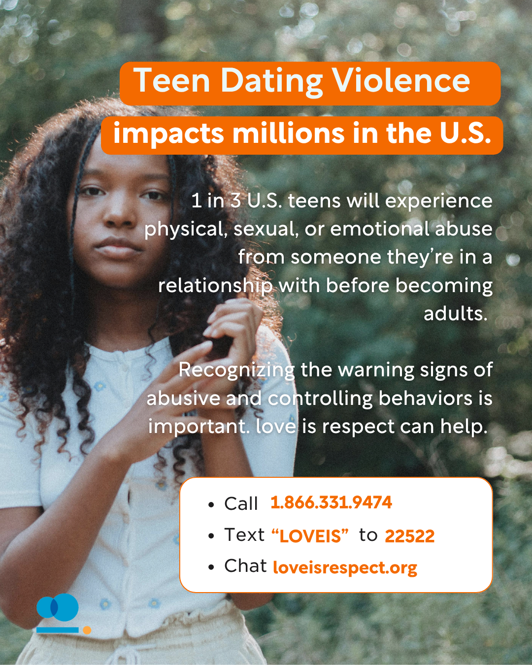 "Dating violence is more common than you may think, especially among teens and young adults. In fact, 1 in 3 U.S. teens will experience physical, sexual, or emotional abuse from someone they're in a relationship with before becoming adults."
