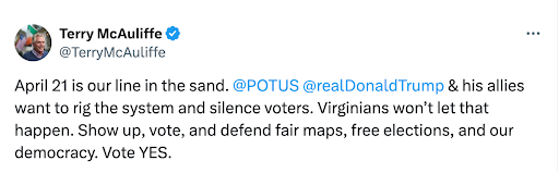 That’s how former Virginia Governor Terry McAuliffe put it on X — urging Virginians to show up and defend the integrity of our elections: