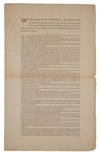 After the delegates signed the Constitution, Philadelphia printers John Dunlap and David Claypoole produced roughly 500 copies at their nearby shop on Second and Market Streets. Delegates, members of Congress, state governors, and even foreign ministers received the printings. See one of the 14 copies known to still exist in America’s Founding, opening Friday, February 13 for a special Presidents Day opening weekend.
