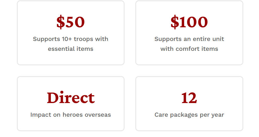 Every care package we send is a reminder that our heroes are not forgotten—that somewhere back home, someone cares enough to make a difference. Your support makes these moments possible.