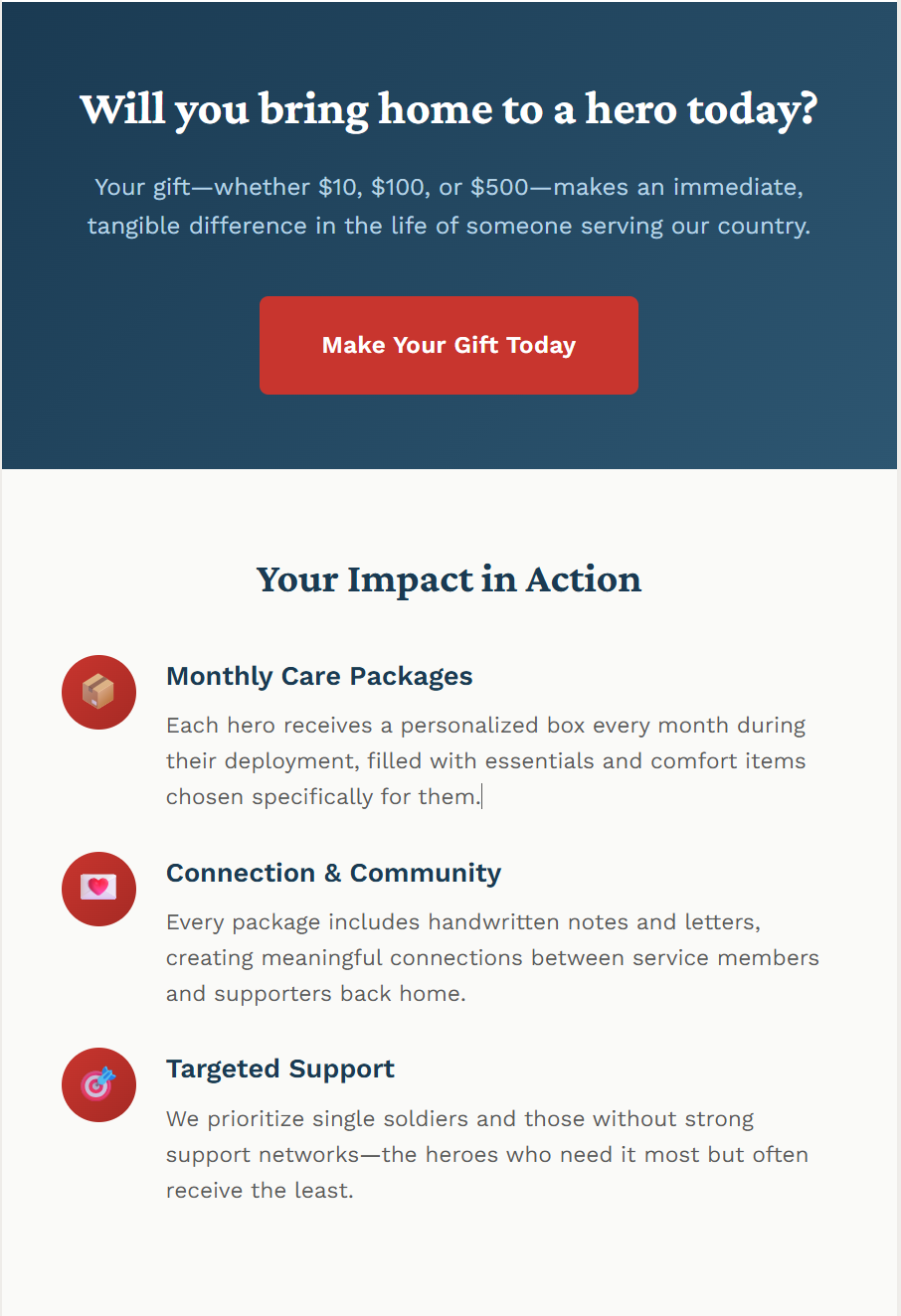 Thank you for considering HeroBox in your giving this year. Together, we're bringing a piece of home to those who've left everything behind to serve us.