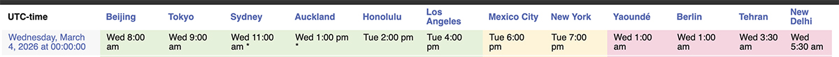 . . . the next day, Wednesday, at 8 a.m. in Beijing, 9 a.m. in Tokyo, 11 a.m. in Sydney, and 1 p.m. in Auckland.
