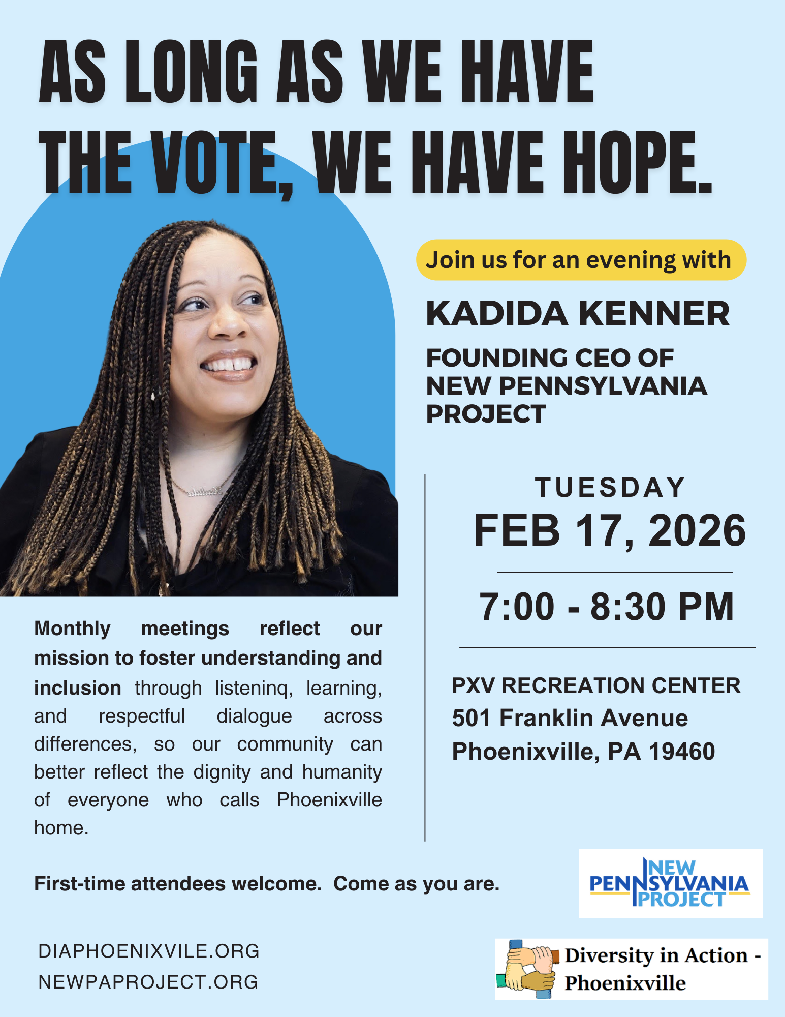 Hosted by Diversity in Action - Phoenixville, join us for an evening with Kadida Kenner. All are welcome, come as you are. |