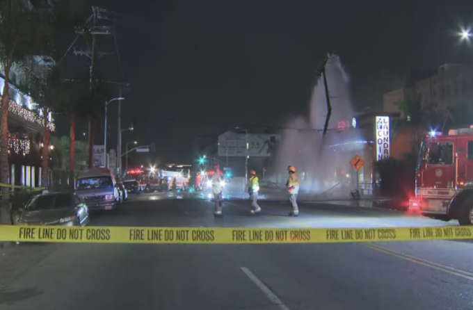 A driver crashed into a water hydrant and power lines during a hit-and-run in Koreatown on Friday morning. The Los Angeles Police Department said the crash took place around 4:40 a.m. in the 700 block of Mariposa Avenue. Firefighters were unable to immediately turn off the water because the car had struck high-voltage wires, which caused a significant hazard. Crews from the Los Angeles Department of Water and Power were requested. The LAPD said the driver fled the scene on foot. There is no suspect description at this time. No injuries were reported during the incident.
