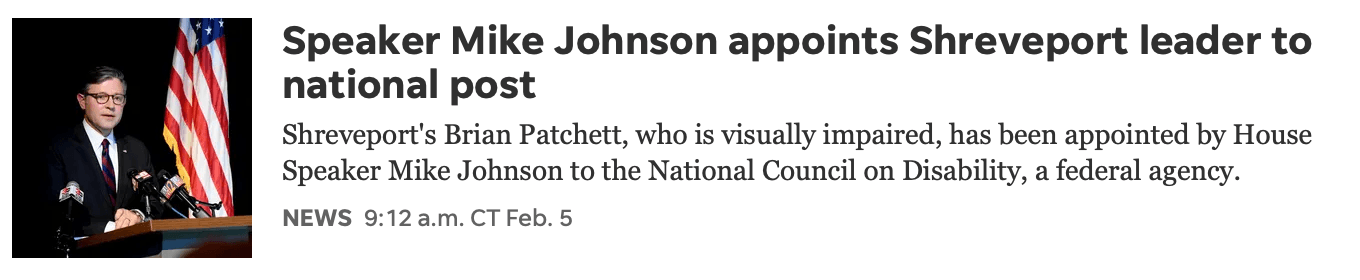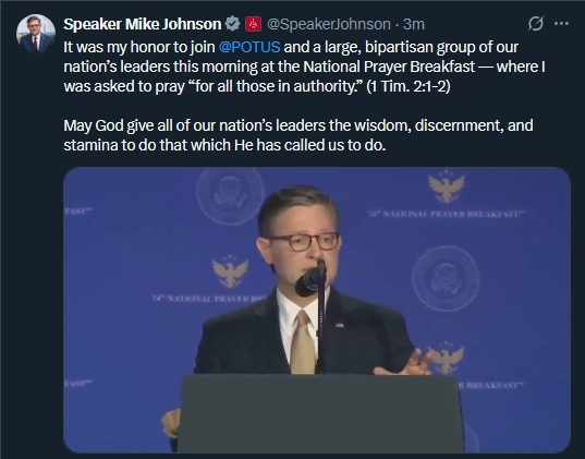 Notes from the Office of Speaker Mike Johnson Hello, friends! Thank you for subscribing to the Office of Speaker Johnson's newsletter highlighting what's happening on Capitol Hill and in Louisiana's 4th Congressional District. | On Tuesday, House Republicans overwhelmingly voted to end the partial government shutdown and fund 11 of the 12 appropriations bills. Following House passage, Speaker Johnson delivered remarks to reporters. Click the image below to watch. | On Tuesday afternoon, Speaker Johnson joined President Trump in the Oval Office as he signed the bill to end the partial government shutdown. | On Tuesday, at the weekly House Republican Leadership press conference, Speaker Johnson discussed House Republicans’ overcoming Democrat objections to responsibly end the partial government shutdown, the status of DHS negotiations, and Republicans making tax filing easier for working families. Click the image below to watch. | On Thursday at the 74th National Prayer Breakfast, Speaker Johnson delivered brief remarks and offered a prayer for our nation and its leaders. Click the image below to watch. | Last week, Speaker Johnson delivered remarks at the Treasury Department's Trump Accounts Summit to highlight this transformational new policy, signed into law through Republicans’ Working Families Tax Cuts bill. Speaker Johnson said, "Good government policy empowers the individual, and it nurtures and encourages the best of human ingenuity and human progress. That's exactly what the Trump Accounts aim to do." Click the image below to watch his remarks. | After Republicans voted to end the partial government shutdown, Speaker Johnson was asked to defend the Biblical case for border security and immigration enforcement. After doing so, Speaker Johnson posted a longer explanation that he drafted during the Biden Administration. Click here to watch Speaker Johnson explain the case, and click the image below for the full written explanation. | On Sunday, Speaker Johnson joined Fox News Sunday and Meet the Press to discuss the state of play regarding the partial government shutdown and the ongoing implementation of the Working Families Tax Cuts legislation as tax season begins. Click the images to watch, and check our YouTube channel for more. | This past weekend, Speaker Johnson spoke with Entergy Louisiana President Phillip May to discuss the progress made to restore power following major outages due to Winter Storm Fern. Crews and lineman have worked around the clock to ensure full recovery for Louisiana residents, and we continue to pray for the communities impacted by the winter weather. | This week, Speaker Johnson appointed Brian Patchett to the National Council on Disability, an independent federal agency within the executive branch focused on advancing policies supporting Americans with disabilities. Mr. Patchett is the President and CEO of the Louisiana Association for the Blind and a current resident of Louisiana’s Fourth Congressional District. Click the image below for more. | Speaker Johnson is honored and proud to represent the great people of Louisiana's 4th Congressional District. He is always grateful for your support. Never hesitate to reach out. Thank you for reading, | Office of Speaker Mike Johnson | Sign up for Speaker Johnson's newsletter to get updates from Washington! | Bossier City 2250 Hospital Drive Suite 248 Bossier City, LA 71111 (318) 840-0309 | Washington, D.C. 521 Cannon House Office Building Washington, DC 20515 (202) 225-2777 | Northwestern State University - Ft. Polk Mailing: P.O. Box 779 Leesville, LA 71496 (337) 423-4232 | DeRidder Mailing: P.O. Box 160 DeRidder, LA 70634 (337) 226-6385 | Ruston 401 N. Trenton St. Ruston, LA 712070 (318) 497-6610 | |