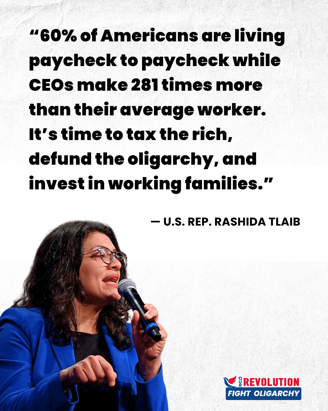 Our Revolution is teaming-up with US Reps. Rashida Tlaib, Pramila Jayapal and others on a new Congressional resolution to Defund the Oligarchs and Fund the People. |