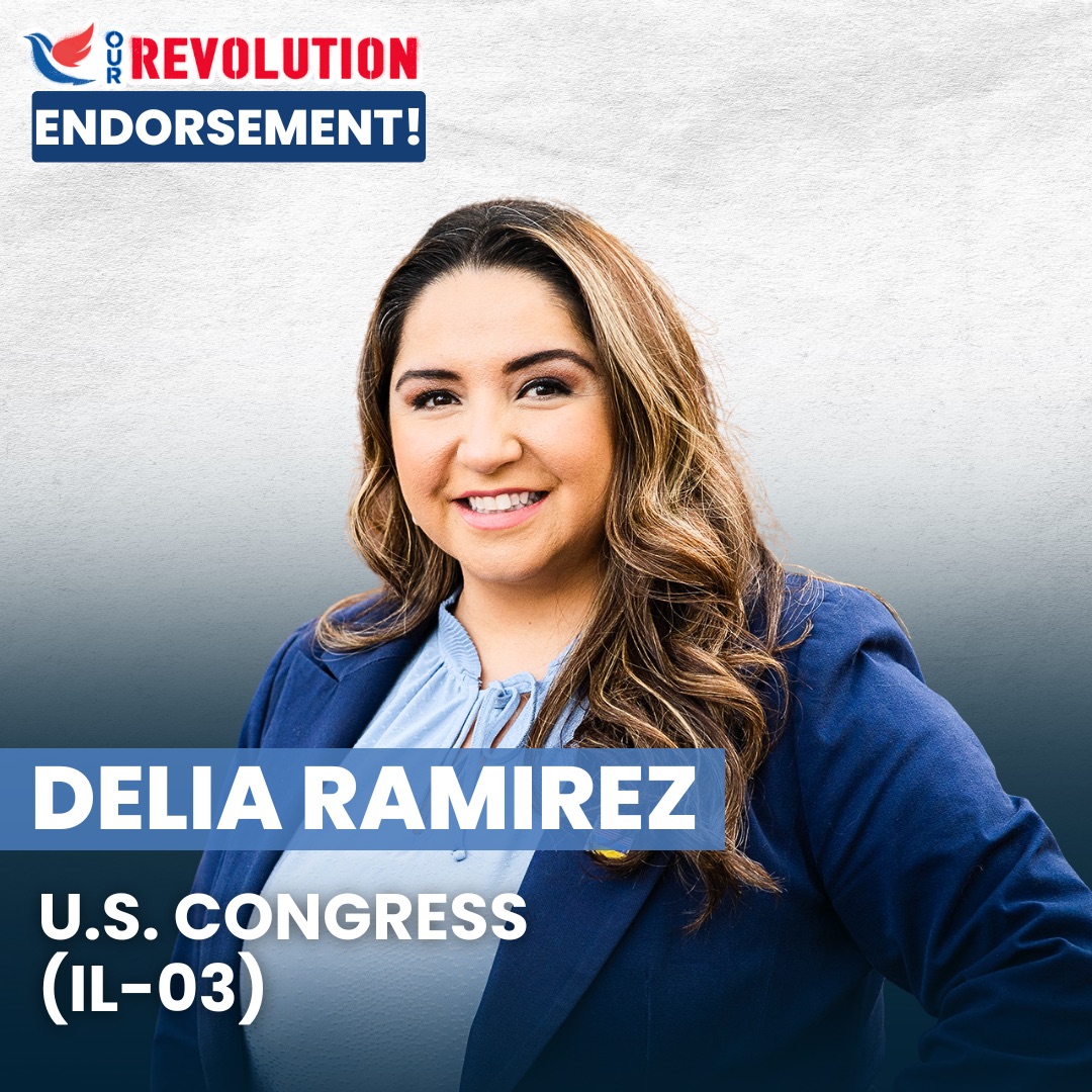 Our Revolution proudly endorses Rep. Delia Ramirez for reelection to Congress. Since taking office, Delia has been a bold leader for Medicare for All, environmental justice, workers’ rights, and immigrant dignity.