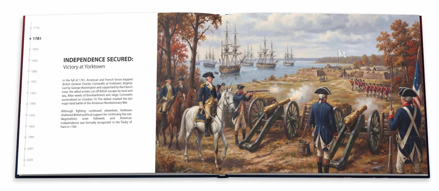 Celebrate the American journey from independence to innovation with this beautifully crafted hardcover coffee table book. America’s 250 Years: A Timeline of Accomplishments presents a curated visual narrative spanning two and a half centuries of history, achievement, and national milestones — designed to be displayed, shared, and preserved. |