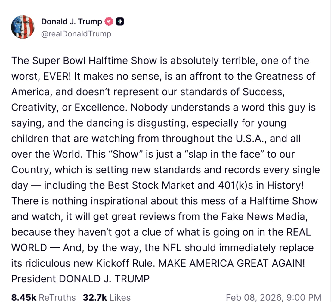 And the best part… Over 60 Million Americans are eligible to become a first wave benefactor in Trump’s Gold Reset. However, only those who download a copy of our 2025 Wealth Protection Guide will know the simple steps needed to take part in this historic wealth reset. Claim Your FREE Guide Now and discover how to position yourself for this golden opportunity. Request Your FREE WEALTH PROTECTION GUIDE Today! Trump slams Bad Bunny’s Super Bowl halftime show as “one of the worst, EVER”President Donald Trump criticized the Super Bowl LX halftime show headlined by Puerto Rican rapper Bad Bunny as “an affront to the Greatness of America” in a lengthy Truth Social post minutes after the performance concluded Sunday night, complaining that “nobody understands a word this guy is saying” since Bad Bunny’s discography is exclusively in Spanish.