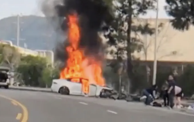 Two people were taken to hospitals Monday morning after a Tesla caught fire following a collision in Los Angeles’ San Fernando Valley. The crash happened around 7:45 a.m. on West Nordhoff Street near Mason Avenue. Video shared on the Citizen app showed the vehicle fully engulfed in flames as fire crews arrived, with debris, including a tire, scattered across the pavement and sidewalk. A woman was seen lying on the ground as several people rendered aid. According to the Los Angeles Police Department, the fire resulted from a collision involving two vehicles. Fire officials initially reported that three people were hospitalized, but LAPD later clarified that two were transported to area hospitals in unknown condition. The Los Angeles County Fire Department’s hazardous materials unit responded because the fire involved an electric vehicle and chemicals associated with its lithium-ion battery, authorities said.