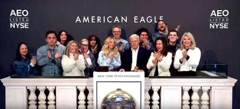 Celebrity Outfit Nod : Sweeney wore jeans and a light blue denim jacket on the trading floor, directly referencing the campaign slogan while also signing a book and appearing on an NYSE billboard for the brand.