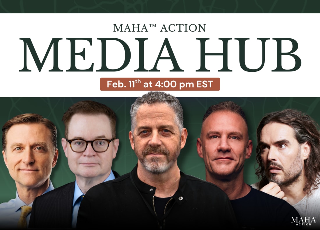 Please join us on Wednesday, February 11, from 4pm - 5pm Eastern, for the MAHA Action Media Hub, featuring the most informed and inspirational voices of the MAHA movement. This week’s session takes a deep dive into the latest wins and Secretary Kennedy’s plans as he continues to transform HHS into a vital engine that works for the American people, not corporate interests. The program features MAHA Action president and host, Tony Lyons; human biologist, biohacker, and longevity expert, Gary Brecka; 17th Administrator of the Centers for Medicare & Medicaid Services (CMS), surgeon, television personality, and health advocate, Dr. Mehmet Oz; celiac disease advocate and young health activist, Jax Bari; globally recognized health educator and author, Dr. Eric Berg; physician, virologist, vaccinologist, and member of the Advisory Committee on Immunization Practices (ACIP), Dr. Robert Malone; founder of GreenMedInfo and natural health researcher, Sayer Ji; biotech innovator, cancer researcher, and immunotherapy pioneer, Dr. Patrick Soon-Shiong; medical freedom and patients rights attorney Rick Jaffe; addiction medicine specialist, media host, and health commentator, Dr. Drew Pinsky; and security expert, author, and health freedom advocate, Gavin de Becker. To attend our media hub, simply click the free registration link here. All Media Hub events are open to the public and the press. We hope to see you on Weds@4pm!! Thank you for subscribing to The MAHA Report You can follow us at: TheMAHA_Report on X You can also follow us at: MAHA Action on Facebook Make America Healthy Again™ and MAHA™ are trademarks owned by MAHA TM LLC |
