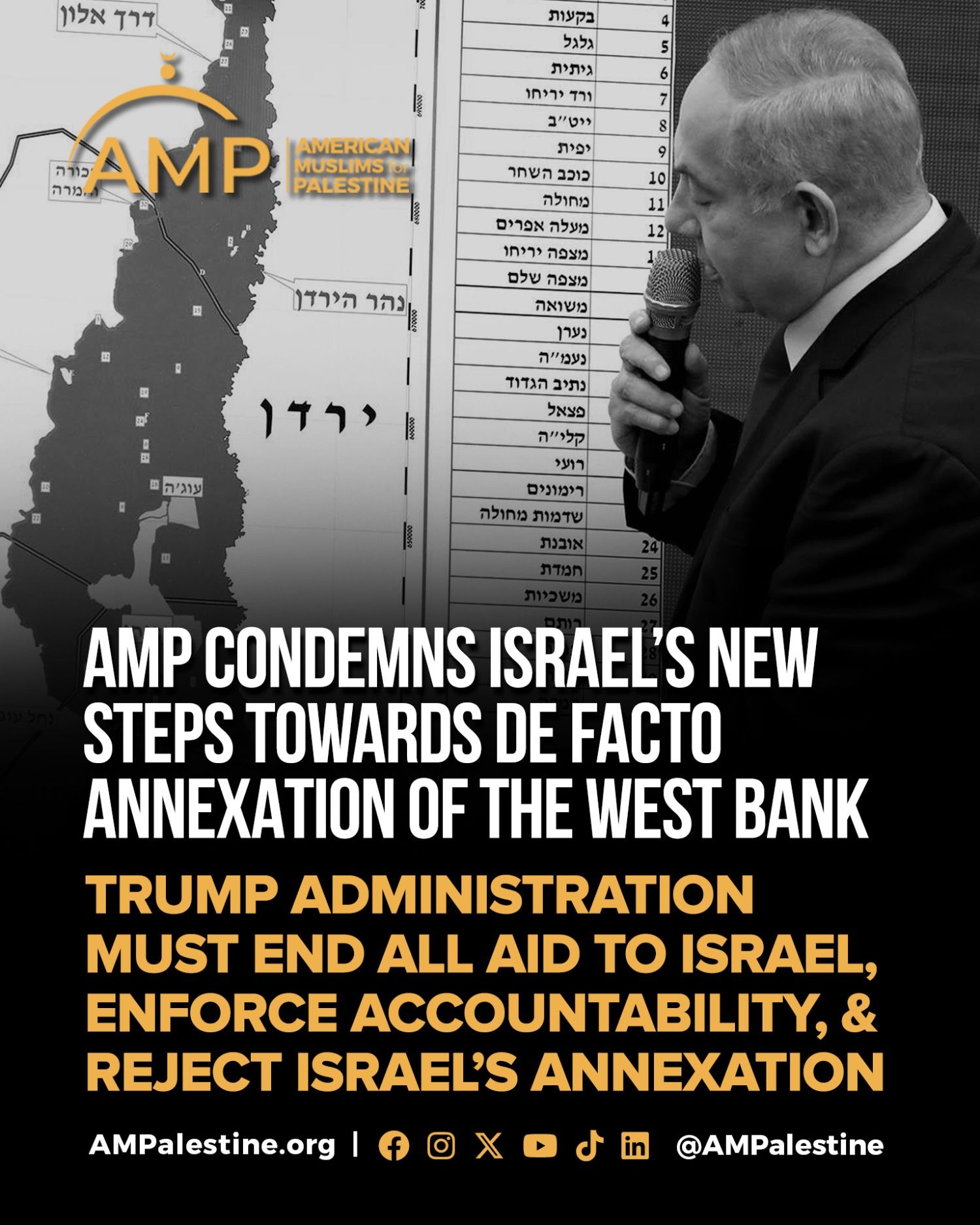 Trump Administration must end all aid to Israel, enforce accountability, and reject Israel’s annexation Dear Email, American Muslims for Palestine (AMP) condemns Israel for granting itself and settlers new “authorities,” further entrenching the occupation and making it easier to steal Palestinian land. These measures, which ease the sale of Palestinian land to Israeli settlers and extend Israeli administrative and enforcement into areas nominally under Palestinian control, constitute a grave escalation of Israel’s apartheid regime and amount to de facto annexation of occupied Palestinian territory. Israel’s new policies are deliberate steps to accelerate Israel’s land theft, ethnic cleansing, and permanent domination of Palestinians. Under international law, Israel is illegally occupying the West Bank, and neither the Israeli government nor Israeli settlers have any legal right to Palestinian land. Yet the Israeli security cabinet has removed internal prohibitions that blocked settlers from purchasing land in the occupied West Bank. This change now allows for private settler land seizures without the state first formally expropriating the Palestinian’s land, accelerating the pace at which Israelis steal the land from Palestinians. Netanyahu’s administration also effectively erased the remaining distinctions between Areas A, B, and C, making it easier to impose Israeli administrative and security control over Palestinians, including in the West Bank’s largest cities. These measures directly empower settlers to steal Palestinian land and, in practice, carry out full annexation of the West Bank, even without a formal declaration. Israel’s decision also represents open defiance of the Trump administration. After symbolic annexation votes in the Israeli Knesset in summer of 2025, President Donald Trump publicly stated that annexation of the West Bank would not be allowed. Vice President JD Vance dismissed those votes as reckless, and Secretary of State Marco Rubio warned that annexation would not receive U.S. support. Israel has now openly ignored those warnings, treating them as mere suggestions and moving forward with policies that achieve annexation in all but name. Netanyahu’s government has done so while the Trump administration continues to push for $3.8 billion in military aid to Israel. “These measures are another shameful step toward Israel’s complete annexation of the West Bank,” said Dr. Abu Irshaid. “But what’s even more shameful is that Israel is openly implementing annexation while the Trump administration responds with empty rhetoric and even rushes to provide Israel billions more in aid.” AMP calls on the Trump administration to stop being walked on by the Israeli government and to move beyond statements and take concrete action against Israel. First and foremost, the United States must name these measures for what they are: de facto annexation and a violation of international law. It must end its complicity by ending all aid to Israel, enforcing accountability, and rejecting Israel’s occupation and apartheid whole stop. Israel’s occupation is illegal. Its settlements are illegal. Its annexation project is illegal. Continued U.S. tolerance and enablement of these crimes is complicity, and history will judge it as such. In solidarity, American Muslims for Palestine (AMP) |