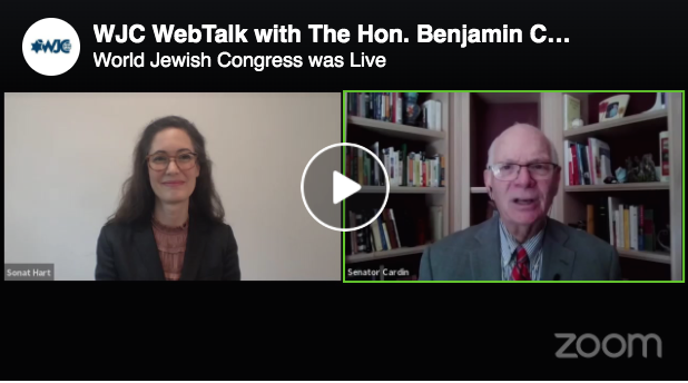 United States Senator Benjamin Cardin discusses the current state of affairs of America’s alliances across the Middle East with WJC Jewish Diplomatic Corps President Sonat Birnecker Hart.