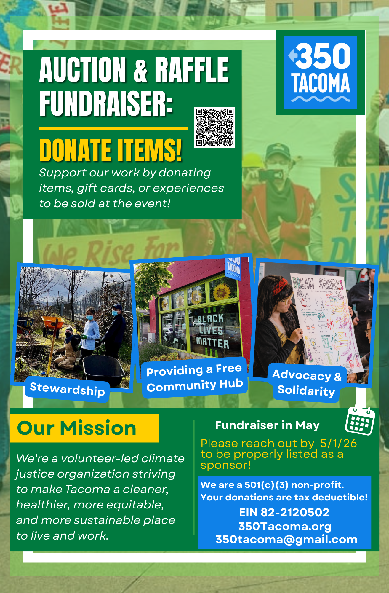 Support 350 Tacoma's work by donating items, gift cards, or experiences to be sold at our fundraiser events this May!