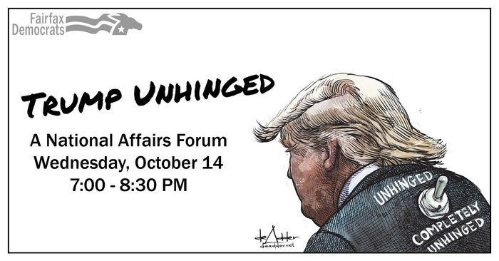 Trump Unhinged: A National Affairs Forum | October 14 | 7:00 PM Join your Fairfax Young Democrats, the Fairfax County Democratic Committee, and the Orange County Democratic Committees for an event analyzing Trump’s debate performance on September 29th with renowned Psychiatrist Dr. Justin Frank and discussing what to expect at the second debate on October 15th. Participants will then be joined by Colonel Lawrence Wilkerson, Transition Integrity Project (TIP) advisor and former Chief of Staff to Colin Powell, to discuss the TIP findings and concerns about the potentially volatile time period between the 2020 election and inauguration. | | |