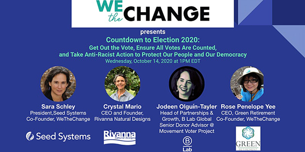 Dear John, ASBC joins with WetheChange in co-hosting a webinar to present a Get Out The Vote (GOTV) strategy to crush voter suppression in the upcoming presidential elections. As the November election is coming closer, ASBC continues to support efforts to mobilize the business community made by to ensure a peaceful, just, and fair electoral process. Join this women-led panel with Crystal Mario (Rivanna Natural Designs, Inc.), Jodeen Olgui-Tayler (B Lab Global), Sara Schley (Seed System, Inc) and Rose Penelope Yee (Green Retirement, Inc) to understand how business leaders across the country are making a difference by promoting participation in their own communities and leveraging their voices in critical times. | |