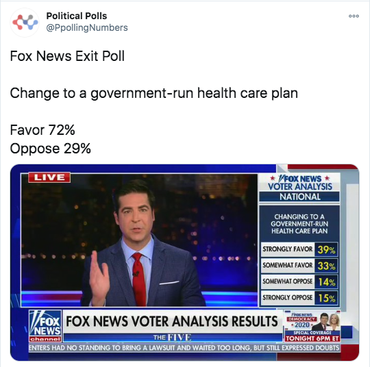 A national exit poll from the network on Tuesday found that 72% of Americans favor changing to a government-run health care plan. Just look: