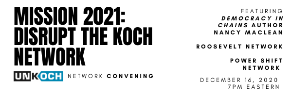 friend, Join us this evening as we come together to celebrate our wins and plan for many more to come in 2021. Along with you and the UnKoch Team, we’ll hear from The Roosevelt Network, Powershift Network, and Nancy MacLean, William H. Chafe Professor of History and Public Policy at Duke University and author of Democracy in Chains: The Deep History of the Radical Right's Stealth Plan for America. Be prepared to be inspired and energized as we head into 2021… together! If you haven't already, sign up now! -The UnKoch My Campus team |