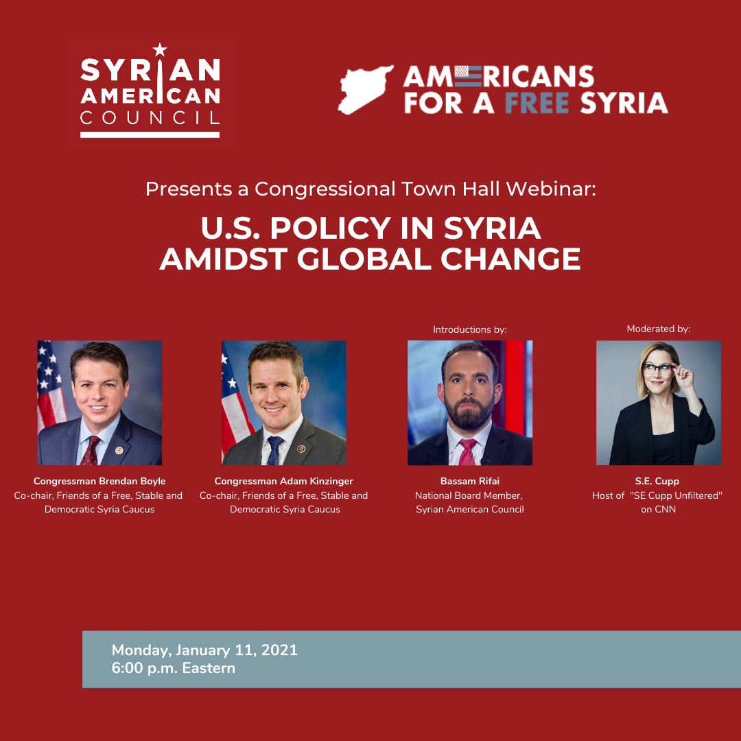 John, There isn't much time left to register for the first virtual town hall of 2021, hosted by Americans for a Free Syria and the Syrian American Council. Join the Co-Chairs of the Friends of a Free, Stable and Democratic Syria Caucus, Representatives Brendan Boyle and Adam Kinzinger, for a conversation covering the future of U.S.-Syria policy in 2021. The discussion will be moderated by renowned journalist and host of S.E. Cupp Unfiltered on CNN, S.E. Cupp, with introductory remarks by the Syrian American Council's own Bassam Rifai. The town hall will begin at 6:00PM EST on Monday, January 11th. Please register as soon as possible via the link below. We look forward to you joining us for this special event. | |