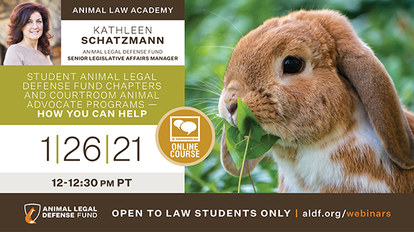 Join us for this webinar in which Animal Legal Defense Fund Senior Legislative Affairs Manager Kathleen Schatzmann and Seton Hall Law School Student Chapter member Alice Huang will share specific actions that law students and Student Animal Legal Defense Fund Chapters can take to significantly impact Courtroom Animal Advocate Program bills.