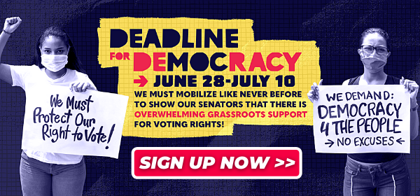 People For Member, Every day we’re getting closer to a very real deadline to take action to pass the For the People Act (S.1): If the Senate does not overcome the filibuster and pass S.1 by August 2021, states will not have enough time to implement the legislation’s regulations before the 2022 midterm elections. And with the current wave of voter suppression laws moving through state legislatures, the For the People Act will be critical to making sure that all voters are able to participate in those national and state elections. Our coalition has grassroots events scheduled all around the country to build pressure on the Senate and next week’s July 4 congressional recess is an especially crucial time for these events and our movement. The For the People Act is the most comprehensive legislation of our generation to strengthen our democracy by protecting and expanding voting rights, stopping partisan gerrymandering, and ending the dominance of Big Money in politics. It’s vital that every single one of our 100 senators sees the nationwide support for this bill because every single one of them has a responsibility to help build a stronger, more inclusive democracy. We and our democracy coalition partners are hosting events all across the country, both in person and virtually, because we want to make sure that everyone can take action to support this critical piece of legislation. Your senators and representatives are likely to see local actions taking place while they’re at home on recess, so please pitch in to help make this democracy work better for us all! RSVP now to take action in support of the For the People Act >> It’s urgent that we work together to spread the word about the importance of the For the People Act before the August deadline. Please sign up now to make this July recess count. >> In community, Sarah, Digital Campaigns Associate