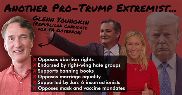 Dear People For Supporter, This is an all-hands-on-deck moment, and we need your help. We’re six days out from the critical Virginia election -- which will set the tone for next year’s midterms and thus control of Congress in 2022. And the polls in the race are TIED. So it all comes down to turnout at this point. To put it simply – we cannot allow far-right Republicans to seize control of this bellwether state and set a disastrous tone for the 2022 midterms. We need to raise another $49,865 right away to keep our ads on the air and our on-the-ground organizing on track. All donations 3X-MATCHED! Please rush in a generous contribution today to GET OUT THE VOTE and keep Virginia blue!>> With so much on the line, the latest polls in the Virginia governor's race are TIED! Unfortunately, we’re already up against some serious headwinds going into 2022: Democrats currently hold razor-thin congressional majorities, and the historical trend in midterms typically swings against the party in the White House. If this bellwether state -- that we've all worked SO hard to turn blue over the last decade -- elects a far-right Trump-supported extremist, it will be our biggest setback yet and make our job in 2022 that much harder. And make no mistake about it; despite his attempts to paint himself as a centrist in public, Republican gubernatorial candidate Glenn Youngkin is ALL-IN on the Far Right’s agenda, including opposing marriage equality, banning books, outlawing abortion, accepting endorsements from hate groups like the Family Research Council, and opposing recommended vaccine and mask requirements to combat COVID. We only have a few days left to put additional resources into our GOTV efforts, and we’re counting on your support as we head for the finish line. With your support, we look forward to keeping Virginia blue next Tuesday and rolling into 2022 with the momentum on our side –- so we hope you’ll pitch in at this critical time. — Will Easton, People For's Digital Team