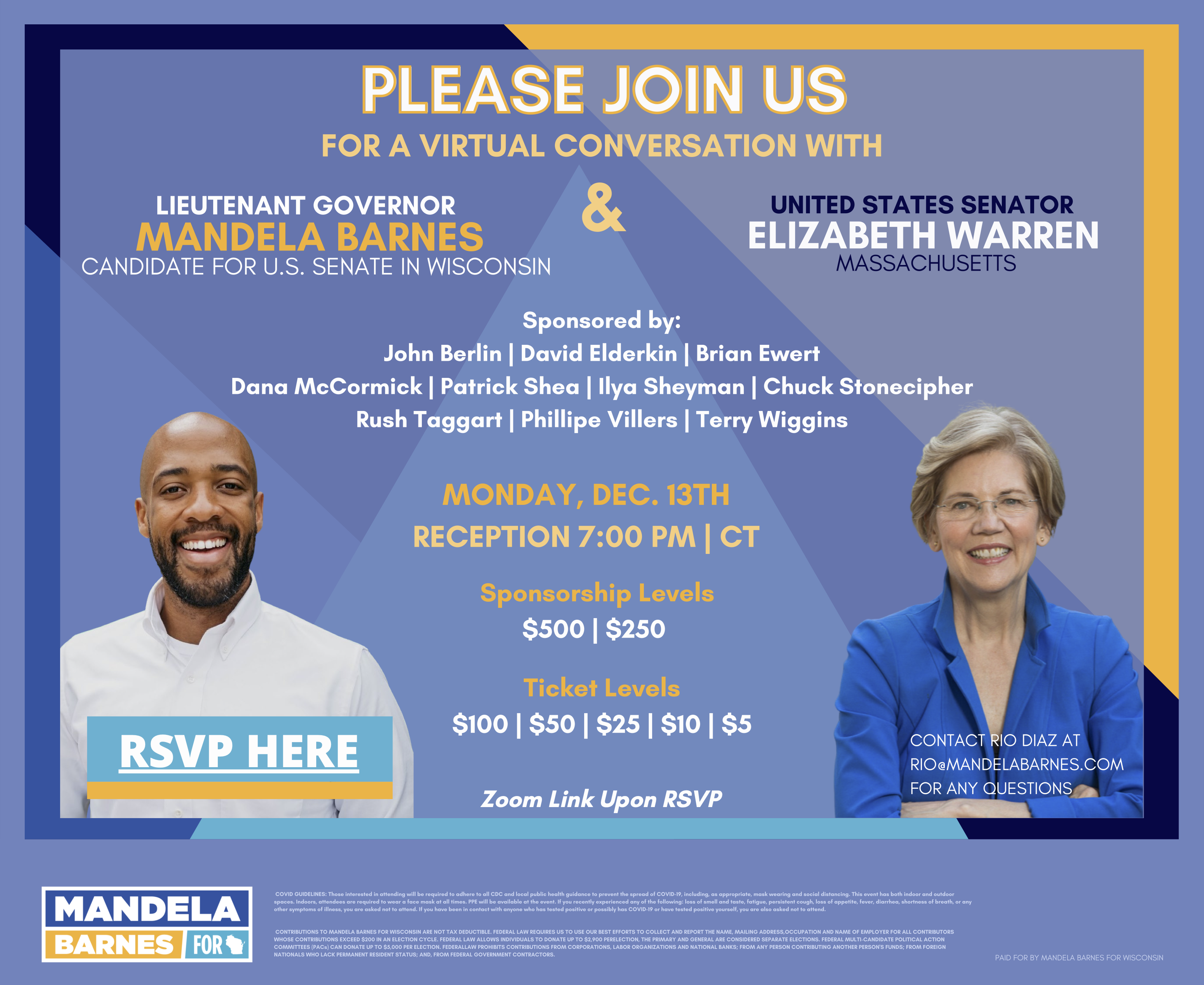 Senator Elizabeth Warren will be joining Mandela this Monday for an exciting virtual event, and you're invited!